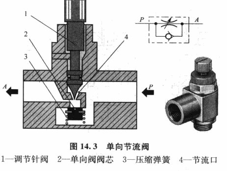 排氣節(jié)流閥是裝在執(zhí)行元件的排氣口處,通過調節(jié)排入大氣的流量,以改變執(zhí)行元件的運動速度的一種控制閥。它常帶有消聲器件,以降低排氣噪聲,并能防止外部環(huán)境通過排氣孔污染氣路中的元件。圖14.4所示是排氣節(jié)流閥的工作原理圖。