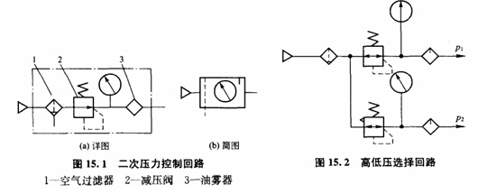 在實際應(yīng)用中,某些氣功控制系統(tǒng)需要有不同壓力的選擇。例如,在加工塑料門窗的三點焊機的氣動控制系統(tǒng)中,用于控制工作臺移動的回路的工作壓力為0.25MPa~0.3MPa,而用于控制其他執(zhí)行元件的回路的工作壓力為0.5MPa~0.6MPa。這種情況可采用如圖15.2所示的高、低壓選擇回路。該回路只要分別調(diào)節(jié)兩個減壓閥,就能得到所需要的高壓和低壓輸出。
