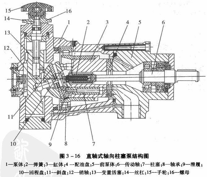 1)典型結(jié)構(gòu)。圖3 -16為液壓機(jī)一直軸式軸向杜塞泵的結(jié)構(gòu)圖。官由斜盤11、柱塞7、缸體3、配油盤4、傳動(dòng)軸6等組成。柱塞的球狀頭部裝在滑履9內(nèi),以缸體為支撐的彈簧2通過鋼球推壓回程盤10,回程盤和柱塞滑履一同轉(zhuǎn)動(dòng)。在排液過程中借助斜盤11推動(dòng)柱塞作軸向運(yùn)動(dòng);在吸油時(shí)依靠回程盤、鋼球和彈簧組成的回程裝置將滑履緊緊壓在斜盤表面上滑動(dòng),彈簧2一般稱為回程彈簧,這樣的泵具有自吸能力。在液壓機(jī)滑履與斜盤相接觸的部分有一油室,它通過柱塞中間的小孔與缸體中的工作腔相連,壓力油進(jìn)入油室后在滑履與斜盤的接觸面間形成了一層油膜,起著低壓支撐作用,使滑履作用在斜盤上的力大大減小,因而磨損也較小。傳動(dòng)軸6通過左邊的花鍵帶動(dòng)缸體3旋轉(zhuǎn),由于滑履9貼緊在斜盤表面上,柱塞在隨缸體旋轉(zhuǎn)的同時(shí)在缸體內(nèi)作往復(fù)運(yùn)動(dòng)。缸體中柱塞底部的密封工作容積是通過配油盤4與泵的進(jìn)出口相通的。隨著傳動(dòng)軸的轉(zhuǎn)動(dòng),液壓泵連續(xù)地吸油和排袖向移動(dòng)(因?qū)蜴I的作用,變量活塞只能作軸向移動(dòng),不能轉(zhuǎn)動(dòng))。通過銷軸12使斜盤11繞變量機(jī)構(gòu)殼體上的圓弧導(dǎo)軌面的中心(即為鋼球中心)旋轉(zhuǎn),從而使外盤傾角改變,達(dá)到變量的目的。當(dāng)流量達(dá)到要求時(shí),可用鎖緊螺母16鎖緊,這種變量機(jī)構(gòu)結(jié)構(gòu)簡(jiǎn)單,但操縱較復(fù)雜,且不能在工作過程中變量。